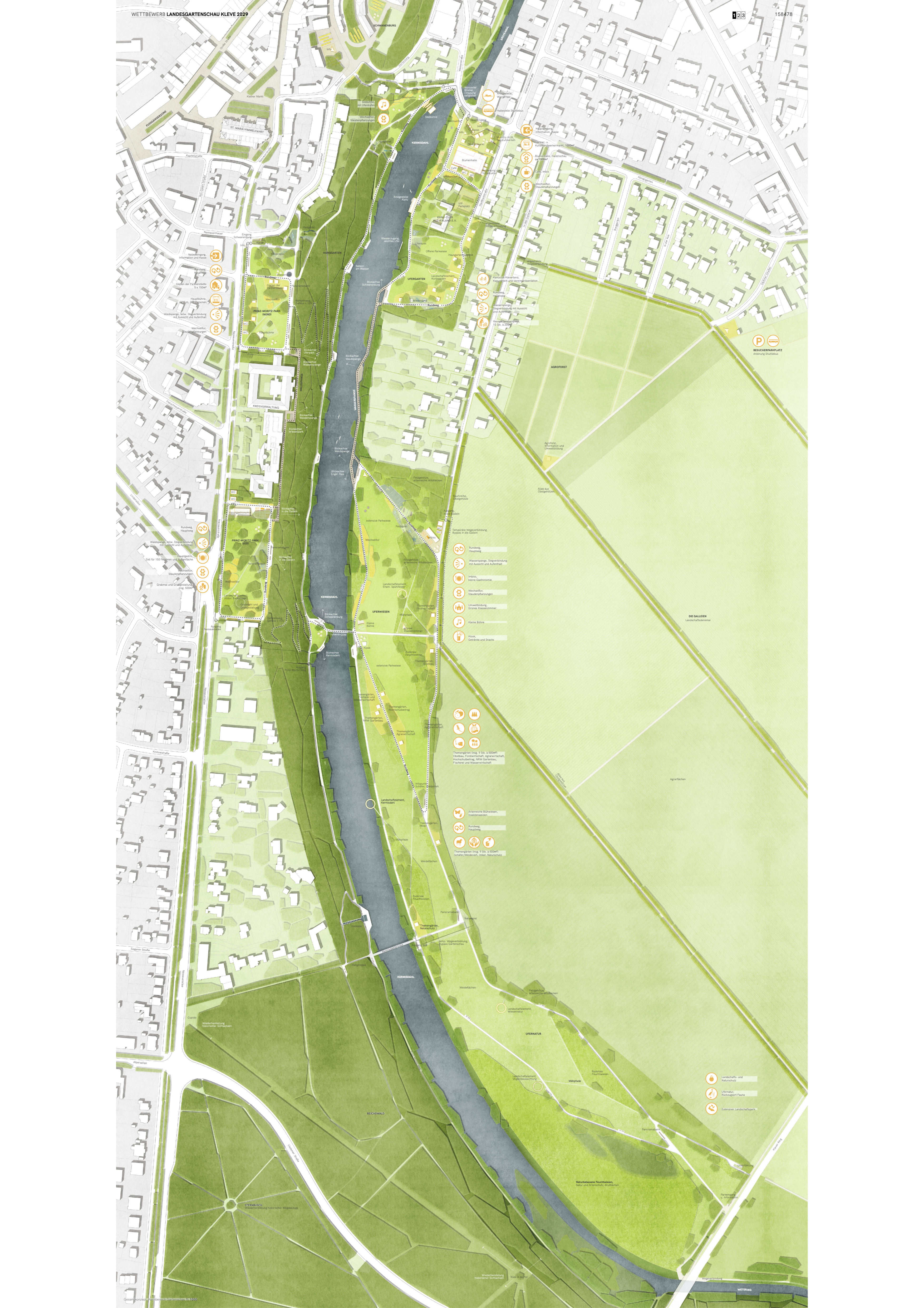 Die größte Stärke entwickelt die Arbeit im Zusammenfügen der neuen Parkbereiche entlang des Kermisdahl. Hier entsteht sowohl für die Gartenschau ein gut bespielbarer Raum als auch für die dauerhafte Nutzung eine Raumfigur, welche die Schnittstelle der Galleien zum Kermisdahl nahezu mühelos als gut erschlossene Uferlandschaft etabliert. Die Maßnahmen zur Verknüpfung der Parkbereiche und die Bauwerke im Hang sind plausibel in Position und Gestaltung.